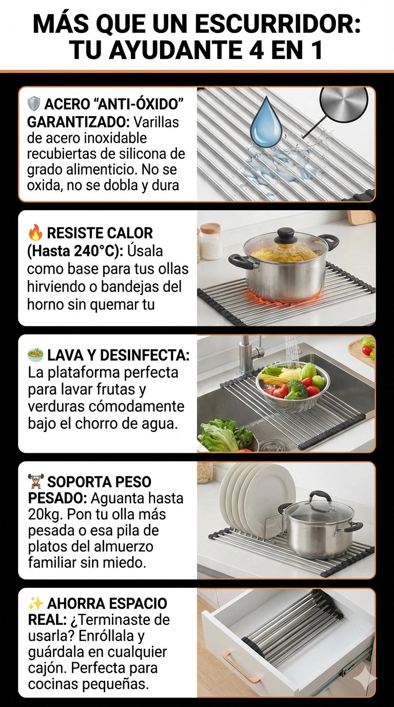 Aunque es compacto, su estructura de acero reforzado soporta el mismo peso que los grandes. Es perfecto para secar la loza del día a día, vasos delicados, o como base térmica para ollas y sartenes en el mesón.